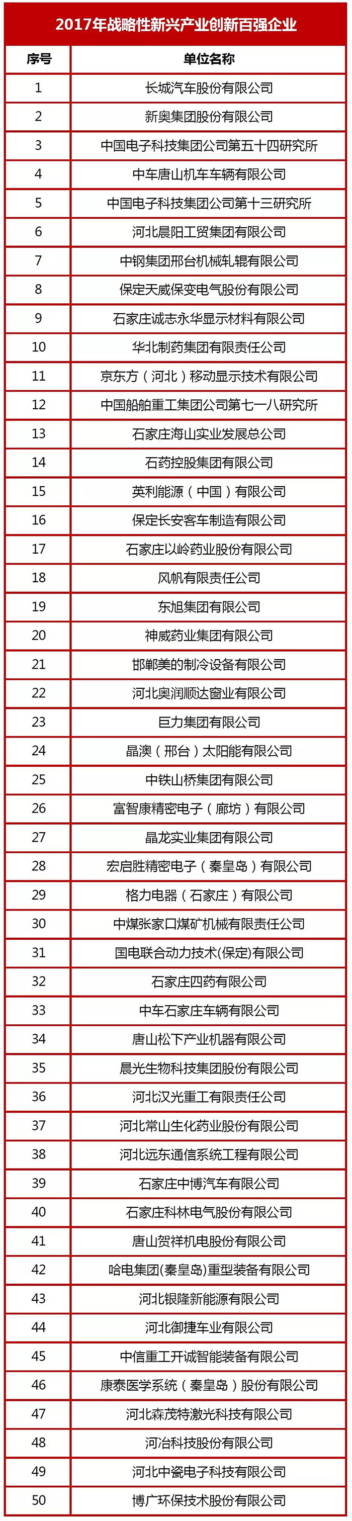 近日,按照河北省战略性新兴产业发展三年行动计划部署要求,省发展改革委、省工业和信息化厅、省科技厅联合发布了2017年河北省战略性新兴产业百强领军企业和创新百强企业名单。